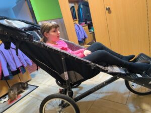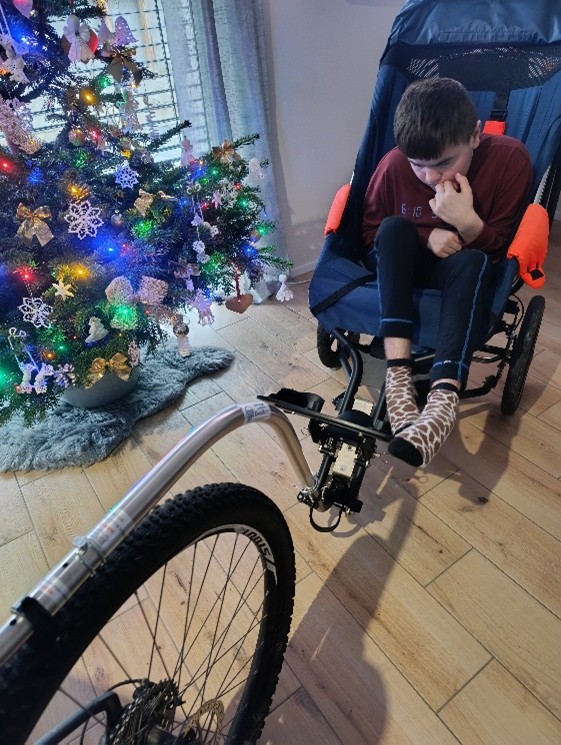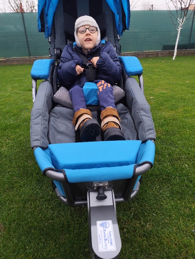 trpí ojedinelou chorobou – mukopolysacharidózou. Aby sa mohol v sprievode mamy presúvať na rôzne terapie a k lekárom, mu Konto Bariéry prispelo na doplnky ku kočíku jedným z nich je tento ťahač za bicykel.