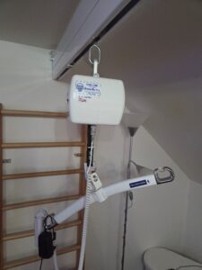 Nepohyblivé deti Sofinka a Alexko sa s pomocou stropného zdviháku pohybujú po dome.